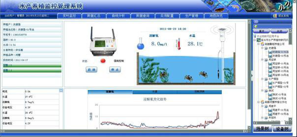 通過采集器和環(huán)境氣象站可以把水產養(yǎng)殖基地水質的含氧量、溫度、光照等參數(shù)和現(xiàn)場氣象參數(shù)傳輸?shù)交ヂ?lián)網平臺,通過數(shù)據(jù)報表、變化曲線和實時圖像方式顯示。用戶登錄環(huán)境監(jiān)測管理平臺就可以查看基地任何時間段內的環(huán)境參數(shù),通過對數(shù)據(jù)圖表的分析可以提供生產管理建議。